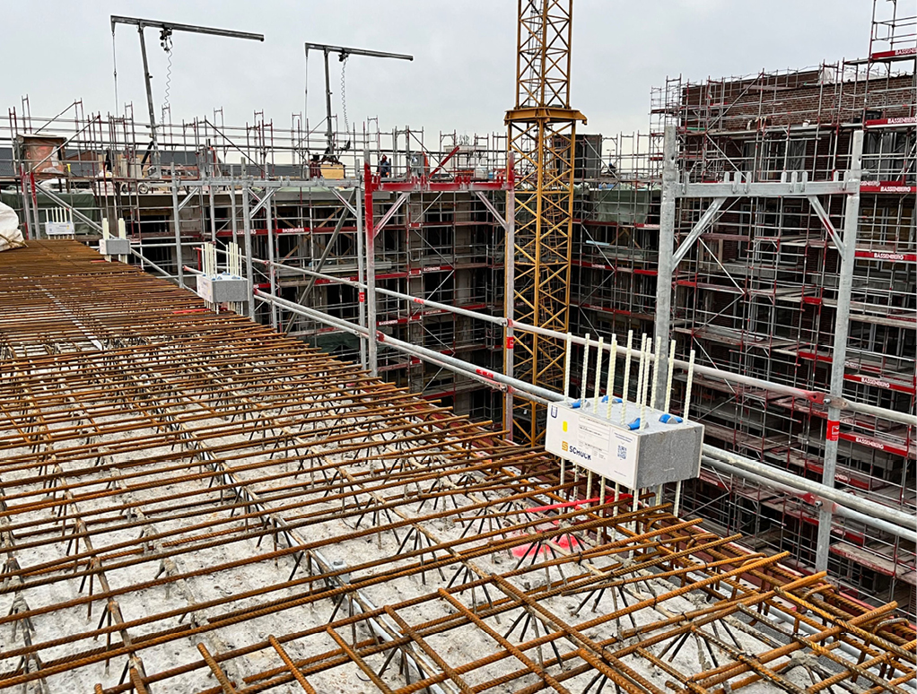 Für die thermische Trennung der Dachterrassenbrüstungen in den Baufeldern A und C kam erstmals Schöck Isokorb® CXT Typ A, das neue, tragende Wärmedämmelement für Attiken und Brüstungen zum Einsatz. Erfolgte die Planung noch mit dem Modell Isokorb ® XT Typ A, ließ sich die ausführende Baufirma Richard Ditting GmbH & Co. KG nach einem Besuch der Schöck Einbaumeister auf der Baustelle vom neuen Isokorb® überzeugen, wie Projektleiter Robin Leupold erläutert: „Der neue Isokorb® für Attiken und Brüstungen ist eine Riesenerleichterung für die Verarbeiter. Sie müssen den Korb nun nicht mehr in die Bewehrung einfädeln, sondern konnten stattdessen die komplette Bewehrung für die Dachdecke herstellen und danach den Isokorb® einsetzen.“