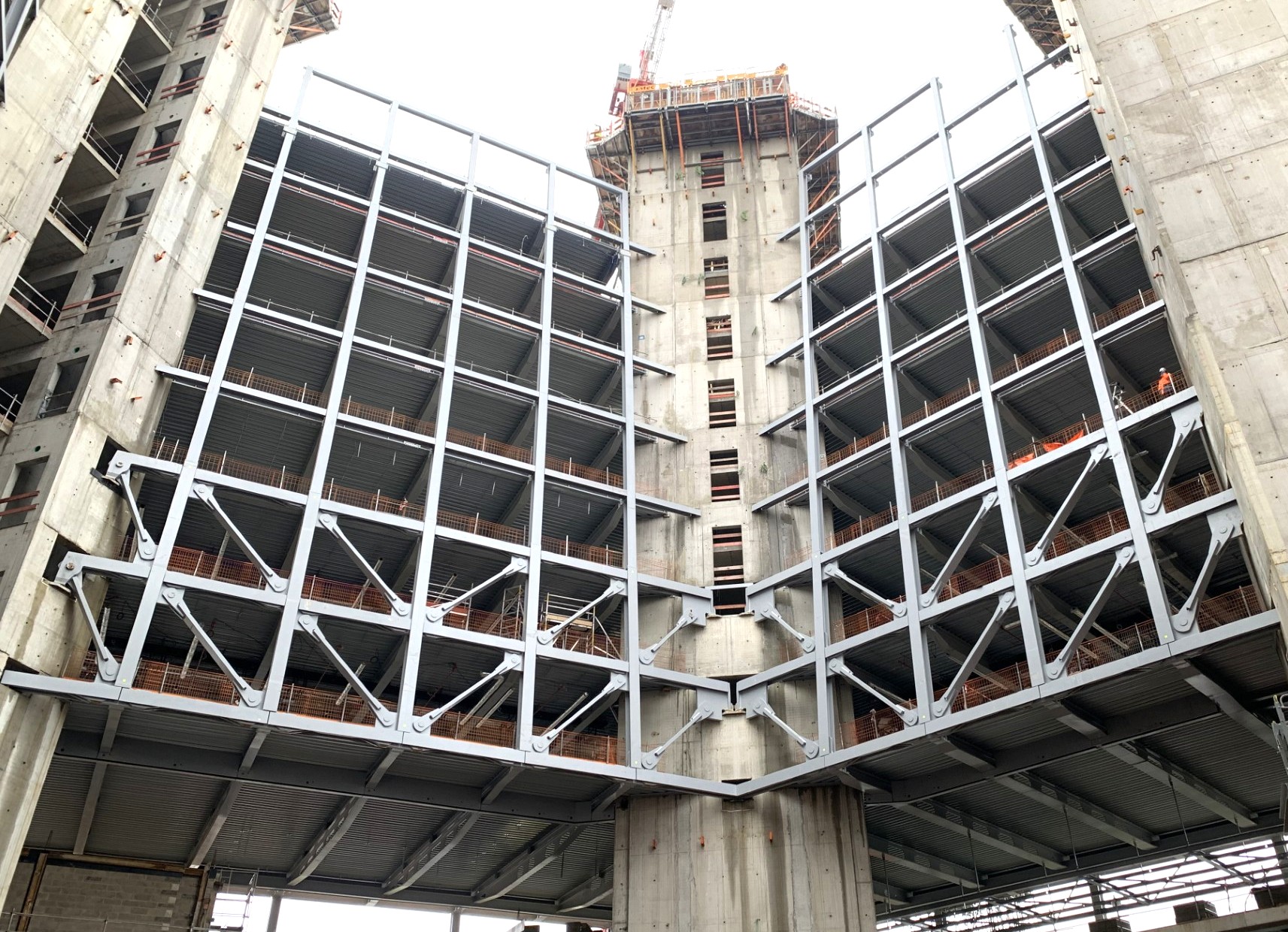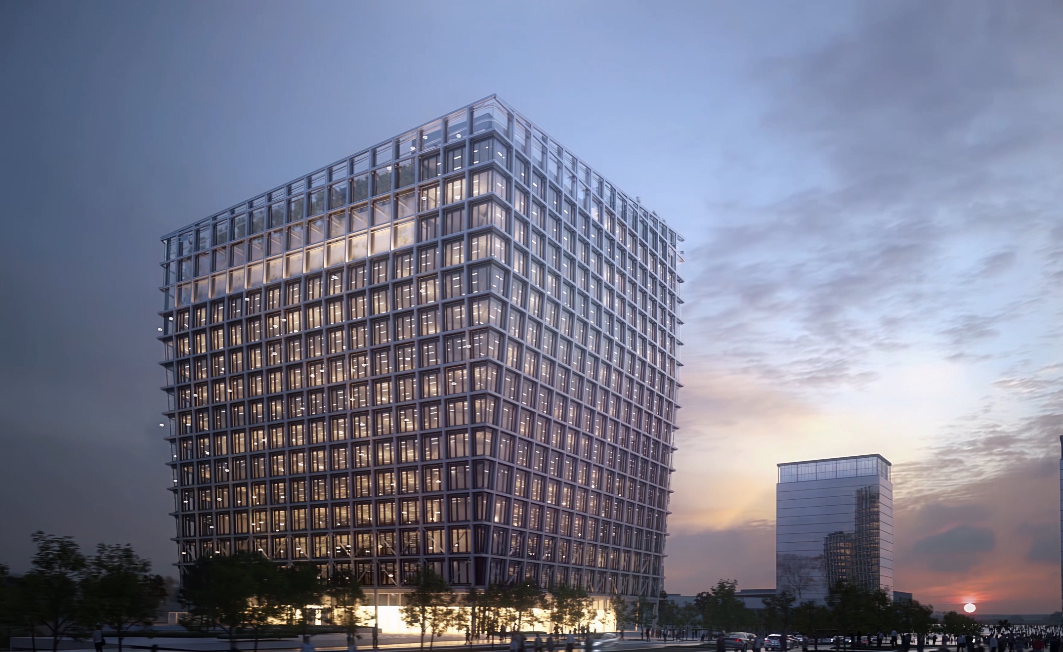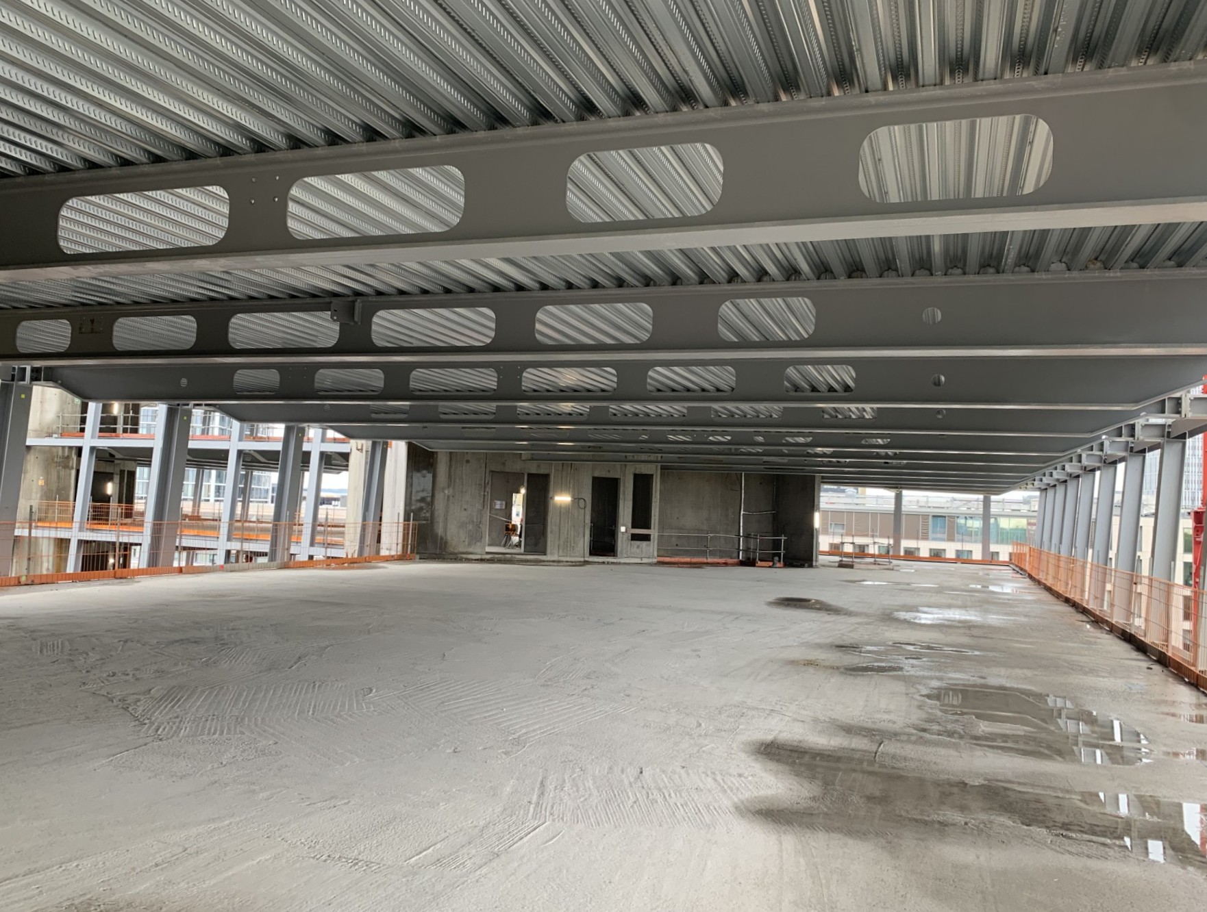 Das U-förmige Bürogebäude mit Atrium in der Mitte soll zukünftig rund 2.600 Menschen Arbeitsplätze bieten und auch teilweise öffentlich zugänglich sein. Dafür sollen Nachhaltigkeit, Innovation und Flexibilität im großflächigen Bauen mit Stahl, Glas und Grünflächen verbunden werden. Das außenliegende Stahltragwerk besteht aus recyceltem Stahl eigener lokaler Herstellung mit erneuerbarer Energie, so dass die Stahlträger einen CO2-Fußabdruck von recht niedrigen 333 kg pro Tonne Stahl aufweisen. Noch interessanter sind die Deckenkonstruktionen mit bis zu 19 m frei spannenden Verbundträgern aus durchbrochenen Zellformträgern und sehr dünnen Verbunddecken. Dies resultiert in außergewöhnlich flexiblen Bürogeschossen ohne Innenstützen und einem Stahlbedarf von trotzdem nur 250 kg/m².