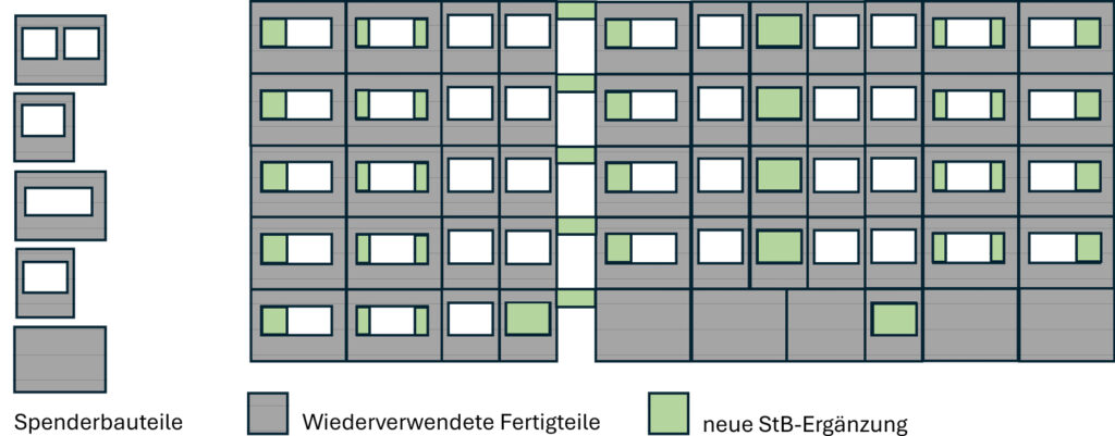 Dieser Entwurfsansatz wurde in einer Masterarbeit an der TU Eindhoven näher untersucht [10]. Analysiert wurde, wie Geometrie, Ausbildung und Zustand gebrauchter Bauteile ihre Einsatzmöglichkeiten beeinflussen. Grundlage war ein Pool an Spenderbauteilen aus virtuell zurückgebauten Bürogebäuden, der auf seine Eignung für den Neubau von Mehrfamilienhäusern geprüft wurde (Bild 4). Für die Wohnbebauung lag bereits ein erster Entwurfsansatz vor.