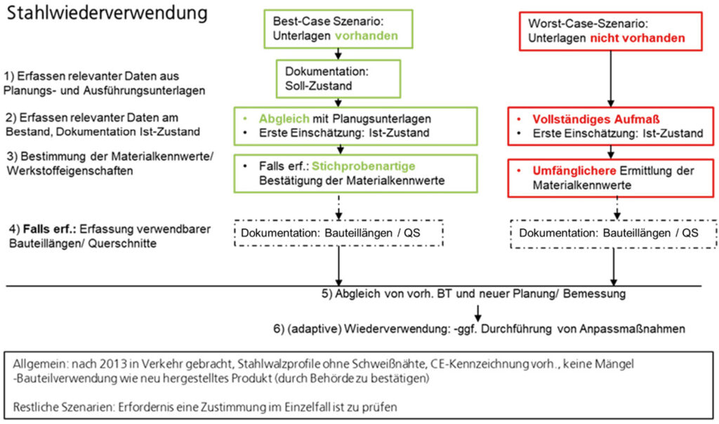 Im April 2023 veröffentlichte das Bautechnische Prüfamt des LBV Brandenburg ein Merkblatt zur Wiederverwendung von tragenden Stahlbauteilen [18]. Es erläutert die Anforderungen für den Verwendbarkeitsnachweis im Rahmen einer ZiE, da Bestandsstahlbauteile häufig nicht der DIN EN 1090-1 entsprechen oder kein Nachweis vorliegt. Die Wiederverwendung wird auf die Zuverlässigkeitsklassen RC1 und RC2 bzw. CC1 und CC2a begrenzt und ist nur für vorwiegend ruhende Belastungen zulässig. Das Merkblatt legt den Mindestumfang der einzureichenden Unterlagen fest und zeigt, abhängig von der Qualität der Bestandsinformationen, auf, welche Qualitätssicherungsmaßnahmen und Materialprüfungen erforderlich sind. Eine Übersicht bietet Bild 7.
