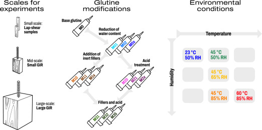 Um diese Schwächen zu überwinden, wurden verschiedene Modifikationsstrategien erprobt. Dazu zählten die Reduktion des Wassergehalts, die Zugabe von Füllstoffen wie Kreide oder Sägemehl sowie die Verwendung phenolischer Vernetzer wie Tanninsäure und Gallussäure. Die mechanischen Eigenschaften der modifizierten Klebstoffe wurden auf drei Skalen getestet: in Lap-Shear-Proben, in mittelgroßen und in großformatigen GiR-Verbindungen.