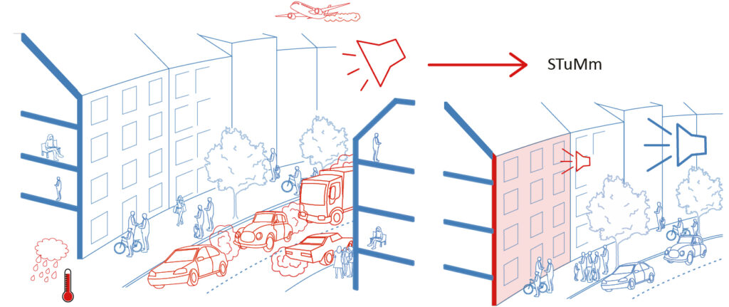 Das interdisziplinäre Forschungsprojekt STumM: Schallabsorbierende Textilfassaden im urbanen Raum – Machbarkeitsstudie verfolgt das Ziel, das Potenzial schallabsorbierender, textiler Vorhangfassaden zur Lärmreduzierung im gebauten Raum zu erforschen (Bild 1). Damit leistet das Projekt einen Beitrag für eine nachhaltige und gesundheitsorientierte Stadtentwicklung.