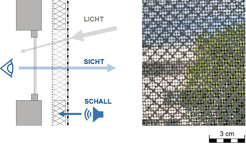 Im Rahmen des Projekts wird für die Anwendung von Textilfassaden der Zusammenhang zwischen Lichtdurchlässigkeit und Schallschutz untersucht. Einerseits ermöglichen textile Materialien eine gezielte Steuerung des Lichteinfalls, sodass natürliches Licht in Innenräume gelangt und gleichzeitig ein Sichtschutz gewährleistet wird. Die hohe Transluzenz von offenen Textilien reduziert allerdings die gewünschte Schalldämpfung. In diesem Zusammenhang ist es entscheidend, geeignete textile Systeme zu entwickeln, die sowohl eine ausreichende Lichtdurchlässigkeit als auch einen effektiven Schallschutz bieten, um den unterschiedlichen Anforderungen an moderne Gebäude gerecht zu werden (Bild 3).