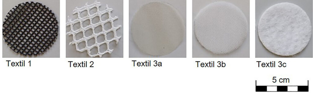 Im Projekt wird die Schallabsorption von unterschiedlichen Textilstrukturen zunächst unabhängig von der Materialität untersucht. Im Gegensatz zu marktgängigen Systemen, die lediglich aus einer Gewebelage bestehen und als Sonnenschutz dienen, werden im Projekt drei Konzepte zur Durchlässigkeit aus mehrlagigen Textilien betrachtet. Der mehrschichtige Aufbau bietet den Vorteil, dass jede Textillage eine spezifische Funktion übernimmt, wodurch multifunktionale Fassadenelemente möglich werden und zudem lichtdurchlässige und opake Elemente je nach Anwendung miteinander kombiniert werden können. Die dazu eingesetzten Textilien sind in Bild 4 dargestellt.