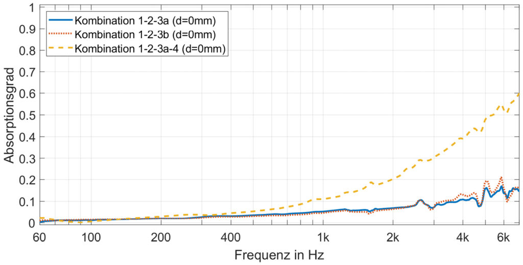 Der akustische Absorptionsgrad der betrachteten Textilkombinationen wurde für den normalen Schalleinfall mithilfe des Impedanzrohrverfahrens nach ISO 10534-2 [21] ermittelt. Die Ergebnisse für den Messaufbau der Materialproben vor dem schallharten Abschluss, ohne dahinterliegenden Luftraum, sind in Bild 6 Schallabsorptionsgrad von drei Textilkombinationen, gemessen im Impedanzrohr ohne Abstand zum schallharten Abschluss über der Frequenz aufgetragen. Hier wird deutlich, dass lediglich die Textilkombination 1-2-3a-4 eine relevante akustische Absorption von ca. 50 % im hochfrequenten Bereich (ca. 6 kHz) aufweist, was aufgrund der groben Struktur von Textil 1 und 2 sowie der geringen Stärke von Textil 3a und 3b zu erwarten war.