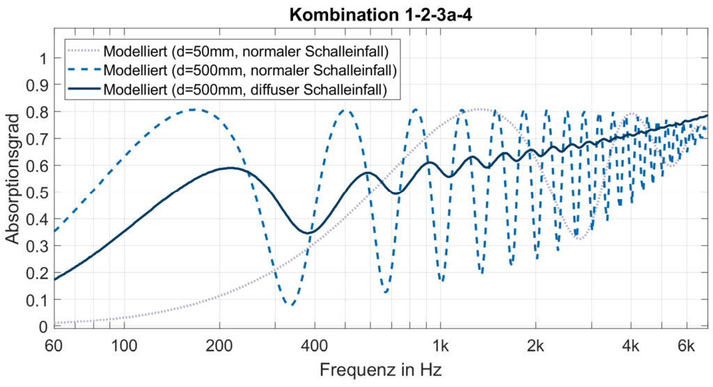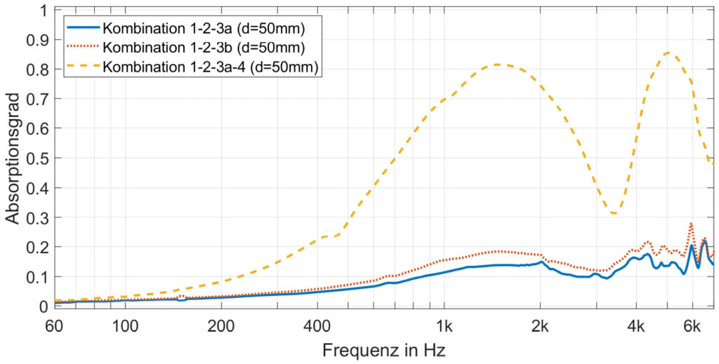 Da in der Praxis Textilien üblicherweise nicht unmittelbar vor einer starren Gebäudewand angebracht werden, wurde zusätzlich ein Abstand zwischen Textil und einer vereinfacht als schallhart angenommenen Gebäudewand betrachtet. In Bild 7 Schallabsorptionsgrad von drei Textilkombinationen, gemessen im Impedanzrohr mit einem Abstand von 50 mm zum schallharten Abschluss ist der gemessene Schallabsorptionsgrad frequenzabhängig für einen hinter der Materialprobe befindlichen Luftabstand von 50 mm dargestellt. Hier ist zu erkennen, dass ein Luftpolster zu einer Erhöhung der Absorption führt.