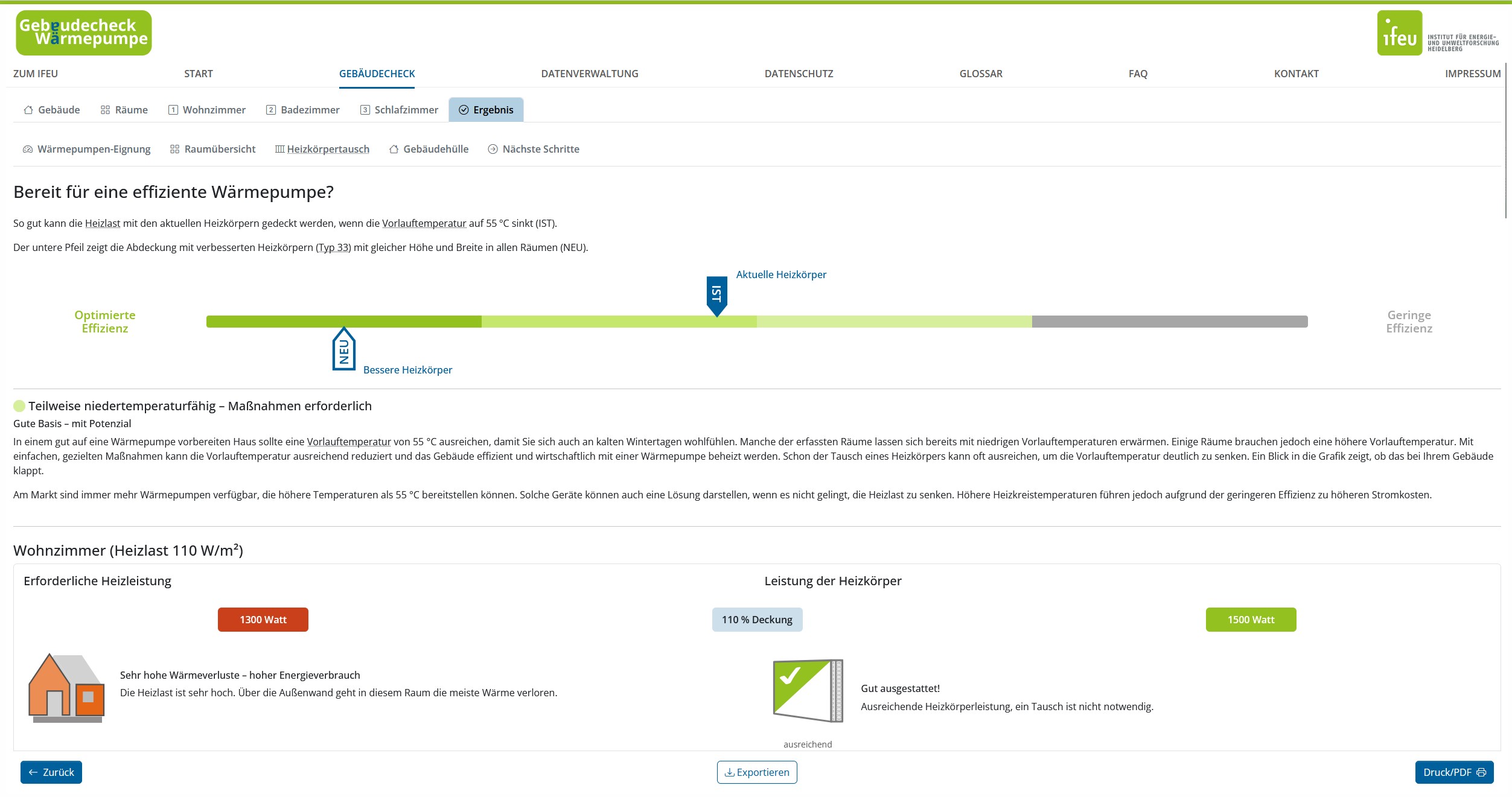 Das Online-Tool ermittelt anhand weniger Angaben zur Immobilie und zu einzelnen Räumen, ob eine Wärmepumpe effizient betrieben werden kann. Dabei wird geprüft: