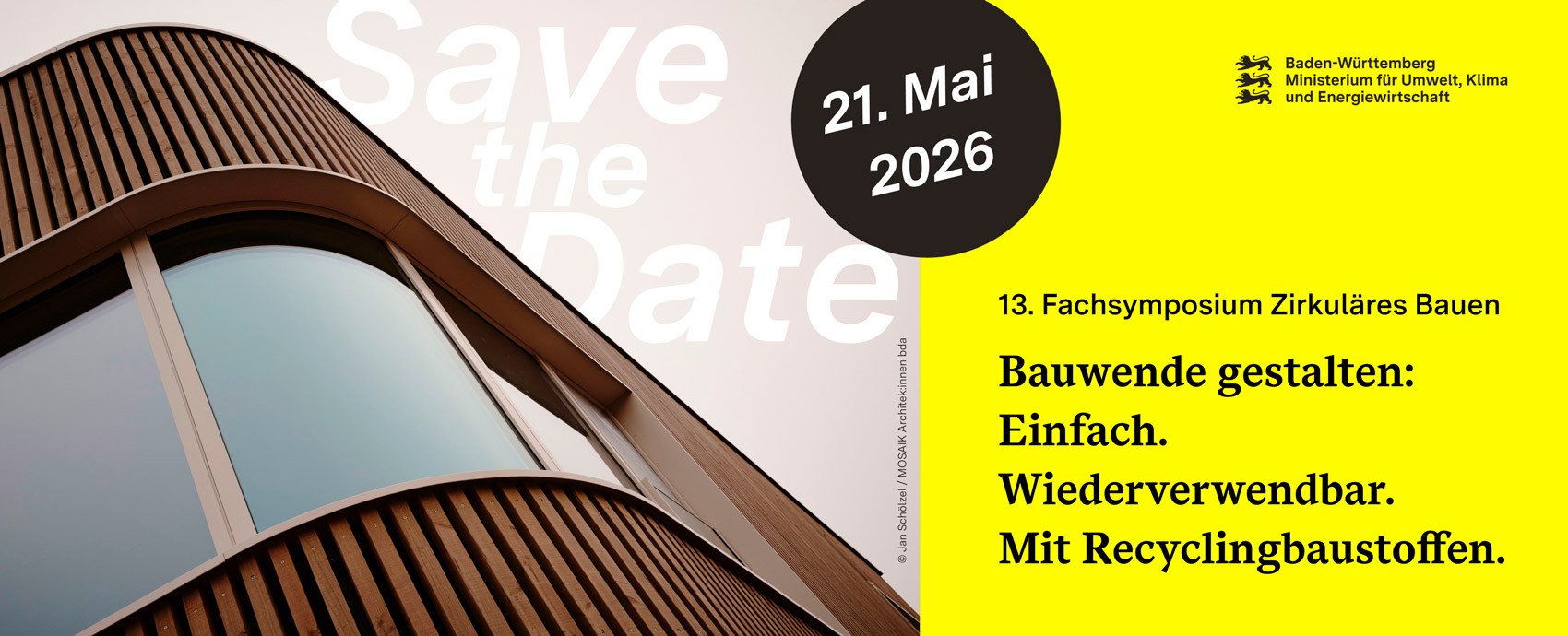 Das 13. Fachsymposium Zirkuläres Bauen 2026 steht unter dem Motto:  Einfach. Wiederverwendbar. Mit Recyclingbaustoffen. Prof. Thomas Auer, Inhaber des Lehrstuhls für Gebäudetechnologie und klimagerechtes Bauen an der TU München, wird den Tag mit einer Keynote eröffnen. Gemeinsam mit Alrun Porkert vom Bundesministerium für Wohnen, Stadtentwicklung und Bauwesen werden im Anschluss Strategien diskutiert, wie nachhaltiges und bedarfsgerechtes Bauen umgesetzt werden kann. Weitere Themen sind: