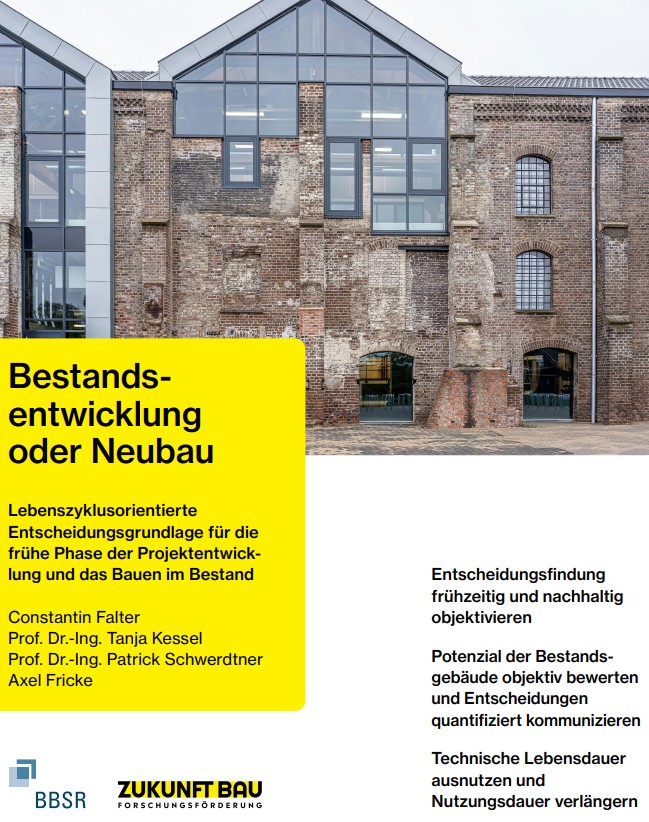 Falter, C.; Kessel, T.; Schwerdtner, P.; Fricke, A. (2025) Bestandsentwicklung oder Neubau: Lebenszyklusorientierte Entscheidungsgrundlage für die frühe Phase der Projektentwicklung und das Bauen im Bestand. Bonn: BBSR – Bundesinstitut für Bau-, Stadt- und Raumforschung [Hrsg.]. Zukunft Bau – Forschung KOMPAKT 4/2025.