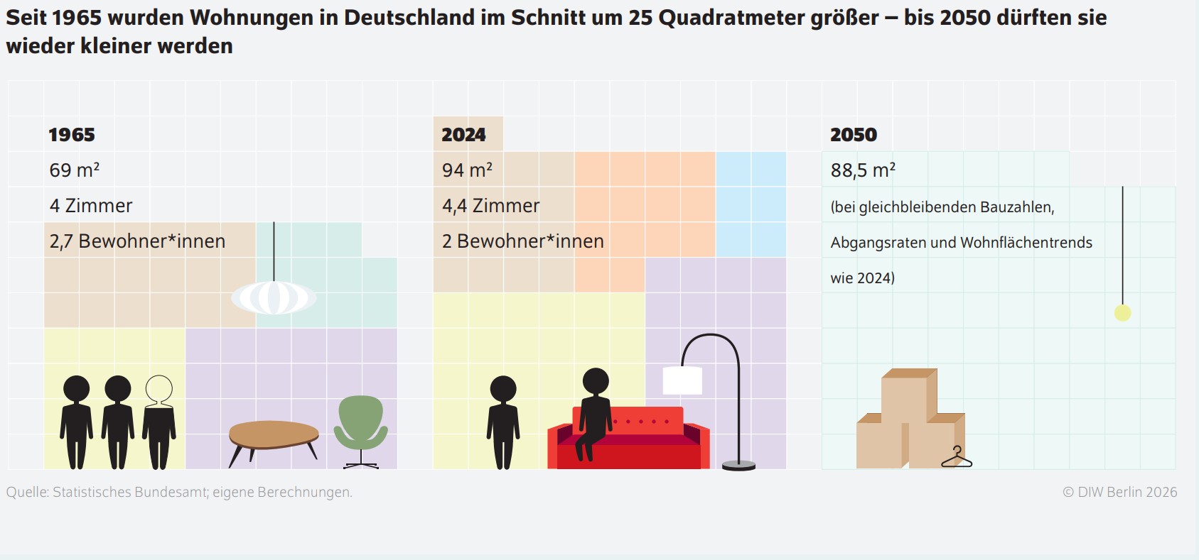 In den vergangenen 150 Jahren hat sich die Wohnfläche pro Person in Deutschland mehr als verdoppelt: von 18,4 m² im Jahr 1956 auf 49,2 m² im Jahr 2024. Dieser Anstieg ist vor allem auf steigende Einkommen und den Bau größerer Wohnungen zurückzuführen. Seit den 2000er-Jahren zeichnet sich jedoch eine Trendwende ab: Die Größe neu gebauter Wohnungen sinkt, insbesondere in städtischen Mietobjekten. Ähnliche Entwicklungen sind auch in anderen Industrieländern zu beobachten.