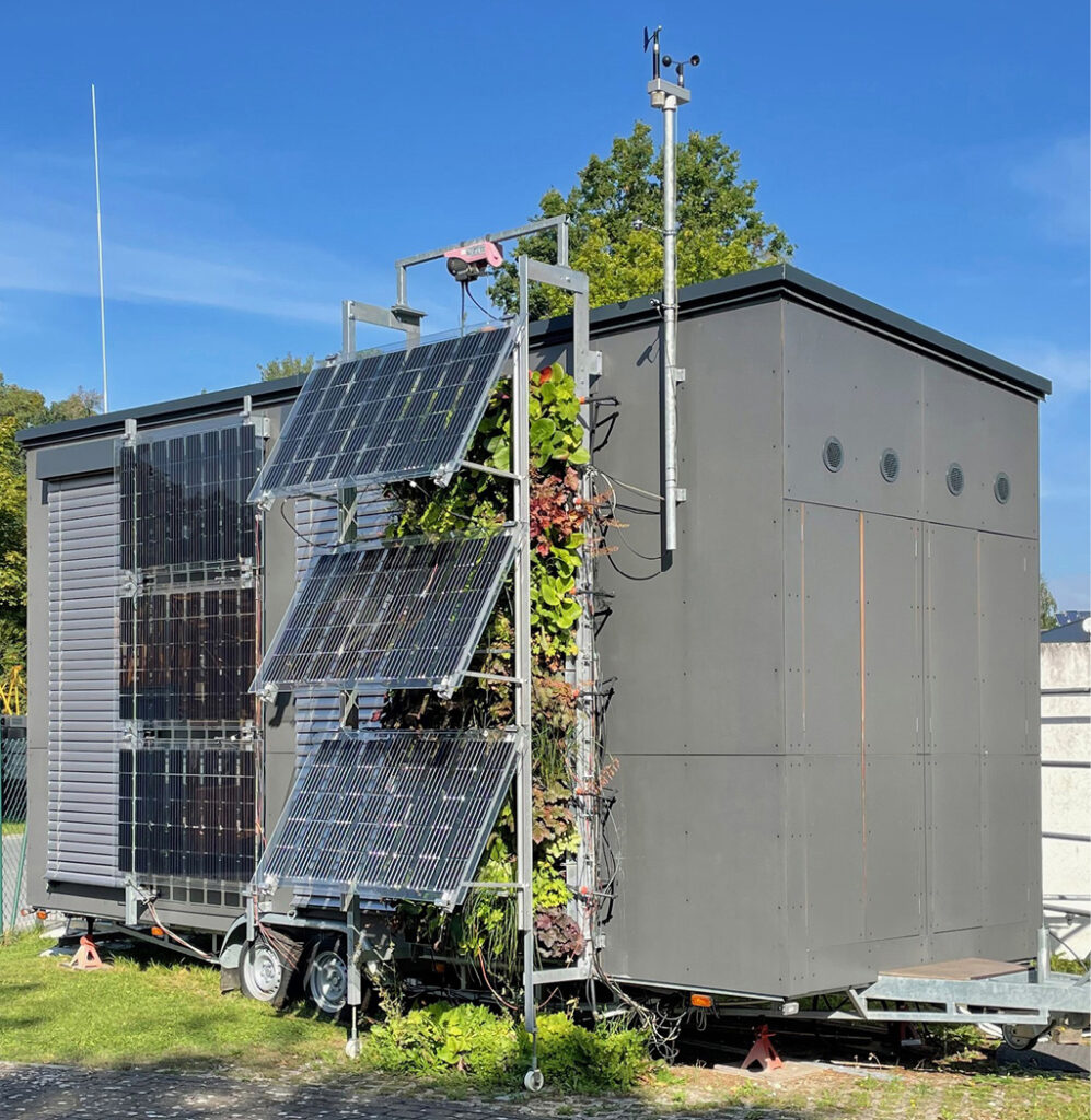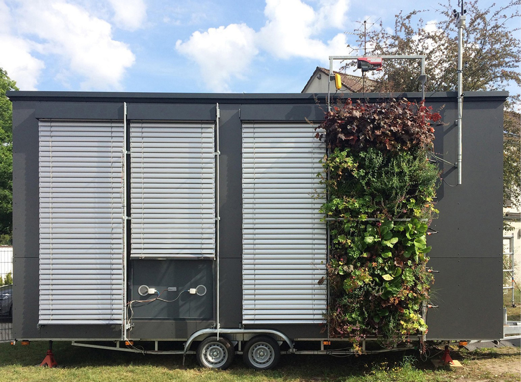 Im Rahmen des Forschungsprojekts EnOB: GreenFaBS [12] konnte an der Ohm die Kombination von Begrünung und dezentraler Fassadenlüftung detailliert untersucht werden ([13]). Das Projekt ermöglichte den Aufbau eines (mobilen) Fassadenversuchsstands auf einer Freifläche des Ohm-Technikums in Rednitzhembach (Bild 2). Damit waren die baulichen Einrichtungen in Verbindung mit einer kleinen Wetterstation und hoher Ausstattung an Messtechnik für experimentelle Studien vorhanden.