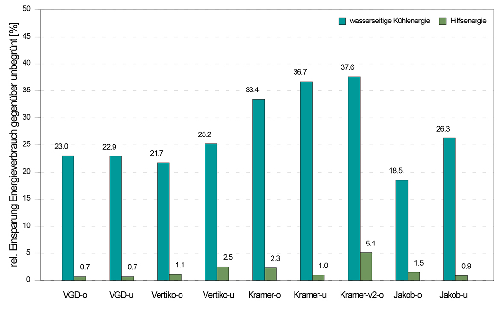 Sowohl die experimentellen Studien mit den vier Begrünungssystemen als auch die Simulationsberechnungen bestätigen in der Kühlperiode von Mai bis September ein Einsparpotenzial beim Kühlenergiebedarf und bei den CO2-Emissionen. Für die Musterräume liegt dieses zwischen 23 und 43 % (Bild 5). Im Vergleich dazu ergeben sich für ein simuliertes Einzelbüro aufgrund abweichender baukonstruktiver Parameter aber geringere Werte (7 bis 25 %).