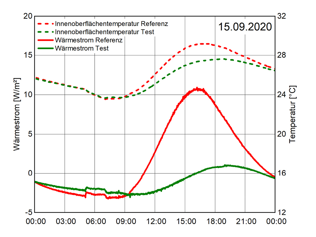 Im Anschluss an diese ersten Einschätzungen auf Basis von Messergebnissen und Simulationsstudien wurden an der Versuchseinrichtung für energetische und raumklimatische Untersuchungen VERU des Fraunhofer IBP weitere Untersuchungen mit einer wandgebundenen Begrünung durchgeführt. Im 2. Obergeschoss des Gebäudes befinden sich südseitig zwei identische Versuchsräume à 20 m2, die speziell für energetische Vergleichsmessungen konzipiert sind.