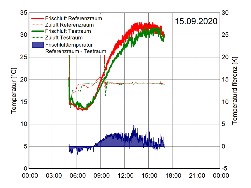 Diese Messungen erfolgten schwerpunktmäßig im September 2020 sowie zwischen Anfang August und Mitte September 2021. Hier zeigt sich, dass die Einsparung bei der thermischen Energie (wasserseitig) der DFL im Testraum zwischen 10 und 25 % gegenüber dem Referenzraum beträgt. Bezogen auf den gesamten Auswertezeitraum von 44 Tagen ergibt sich eine Einsparung von etwa 14 %. Ferner belegen die Untersuchungen zwei weitere Effekte durch die Pflanzen: Einerseits führt die Begrünung zu einer Reduzierung der Ansauglufttemperatur der DFL-Geräte (um bis zu 3 bis 4 K) (Bild 6). Andererseits trägt die Verschattung zu einer niedrigeren Fassadentemperatur bei, wodurch sich die solaren Einträge in den Raum reduzieren (Bild 7).