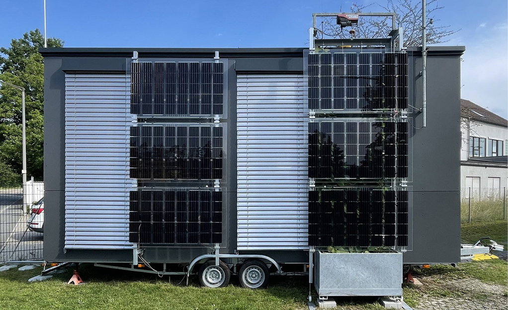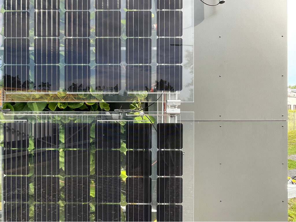 Im Rahmen der Projektstudie „GreenPV“ [18] wurden an dem Fassadenversuchsstand von Ohm-AR semitransparente PV-Module verwendet. Durch die rahmenlose Konstruktion und die transparente Rückseite ist eine ausreichende Solarstrahlung für die dahinter angeordneten Pflanzen sichergestellt. Die Versuchsreihen wurden mit zwei verschiedenen Abständen der Photovoltaik-Module zur Begrünung durchgeführt: 33 cm und 52 cm.