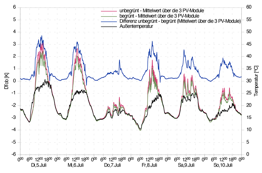 Die Versuche zeigen, dass die Oberflächentemperatur auf der Rückseite der PV-Module durch die Begrünung im Maximum um bis zu 4,0 K verringert wird (Bild 10). Ebenso wird deutlich, dass das Misch-/Regalsystem sowie das wandgebundene System eine etwas größere Reduzierung bewirken als die Kletterpflanzen. Dies ist auf den zusätzlichen Kühleffekt durch das feuchte Substrat bzw. das durchfeuchtete Geotextil zurückzuführen. Bei allen Systemen lässt sich ein Einfluss des Abstands der PV-Module zum Begrünungssystem auf die Oberflächentemperatur erkennen. So bewirkt hier ein größerer Abstand zumindest eine etwas stärkere Abminderung der maximalen Oberflächentemperaturen. Diese sind jedoch stark von den zum Messzeitpunkt vorliegenden klimatischen Bedingungen abhängig; so führen höhere Außentemperaturen zu größeren Werten.