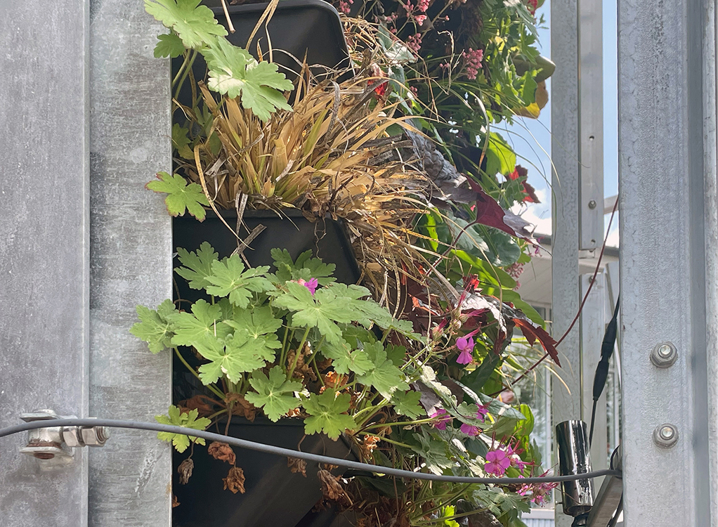 Die einzelnen Begrünungssysteme leisten auch eine Abminderung der Lufttemperaturen zwischen den PV-Modulen und den Pflanzen im Vergleich zum unbegrünten Referenzfall. Es zeigt sich auch hier, dass mit den beiden wandgebundenen Systemen eine etwas größere Reduzierung erfolgt. Damit bestätigt sich, dass die PV-Module den Hitzestress der Pflanzen reduzieren. Während der Messungen im Sommer 2022 und 2023 waren bei den Versuchsanordnungen keine negativen Auswirkungen auf den Wuchs sichtbar, trotz der relativ starken Abkopplung vom Umgebungsklima (Bild 11). Darüber hinaus lässt sich feststellen, dass die Begrünung auch Einfluss auf die empfundene Raumtemperatur hat. Im Durchschnitt kann diese um bis zu 1,1 K abgesenkt werden.