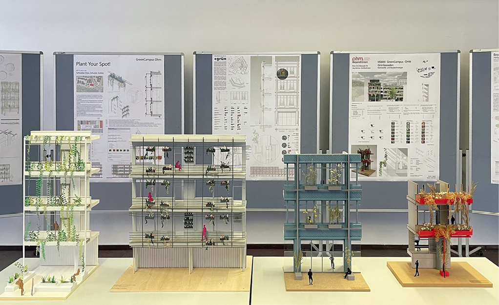 Im Masterseminar „GreenCampus-Ohm“ [23] wurden diese Potenziale exemplarisch in Verbindung mit Hochschulgebäuden der Ohm untersucht (Bild 13). Zur Auswahl standen zwei Bestandsgebäude, die für nachträgliche Begrünung geeignet sind und bei denen erhöhter Bedarf für Verbesserungen des sommerlichen Wärmeschutzes und der Verschattung vorliegt, sowie das im November 2025 eröffnete Ohm Innovation Center. Ausgehend von objektspezifischen konstruktiven Anforderungen der Gebäude und Bedürfnisanalysen der jeweiligen Nutzer:innen erarbeiteten die Studierenden verschiedene Szenarien für Begrünungen mit Kletterpflanzen in Trogsystemen. Die Entwürfe wurden anhand eines Fassadenausschnitts zeichnerisch konstruktiv und atmosphärisch vertieft, einschließlich Vorschlägen für die Bepflanzung, und im Modell ausgearbeitet (Bild 14).