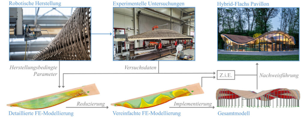 Der Hybrid-Flachs Pavillon der Landesgartenschau 2024 in Wangen im Allgäu dient als Demonstrator für die Entwicklung, Herstellung und Verwendung neuartiger, robotisch gefertigter Naturfaserelemente auf Basis von Flachsfasern in einer Gebäudestruktur. Ziel war es, ein leichtes, ressourceneffizientes und zugleich leistungsfähiges Konstruktionssystem auf Basis von Naturfasern für lastabtragende Bauteile zu demonstrieren. Dafür wurden Brettsperrholzplatten mit robotisch gefertigten Flachsfaserbauteilen zu einem leichten, tragfähigen Hybridsystem kombiniert. Die Flachsfasern übernehmen vorwiegend Zugkräfte und verstärken die Platten, wodurch große Spannweiten mit geringer Plattendicke realisiert werden können. Detaillierte und vereinfachte Finite-Elemente-Modelle wurden anhand großmaßstäblicher Versuche abgeleitet. Die vereinfachten Modellierungsansätze zeigen eine sehr gute Übereinstimmung bei Verformung, Zug- und Schubkräften gegenüber den detaillierten Modellen und ermöglichen eine effiziente Berechnung im Gesamtmodell des Pavillons. Die erfolgreiche Anwendung der Hybridbauteile im Flachsfaser-Hybrid-Pavillon eröffnet die Möglichkeit, ähnliche Leichtbaukonstruktionen aus regionalen Naturfasern in zukünftigen Bauprojekten zu realisieren und die entwickelten Modellierungsansätze auf weitere Faserkörperstrukturen zu übertragen.