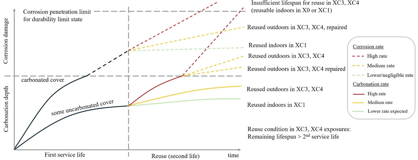Das Forschungsteam leitet daraus einen klaren Prozess für die Praxis ab: Zunächst müssen reale Materialzustände – etwa Karbonatisierungstiefe, Betonüberdeckung und sichtbare Schäden – erfasst werden. Anschließend können probabilistische Modelle die erwartbare Restlebensdauer bestimmen. Bei zu kurzer Lebensdauer kommen Reparaturen, geänderte Nutzungsklassen oder eine weniger belastende Platzierung im neuen Gebäude infrage.