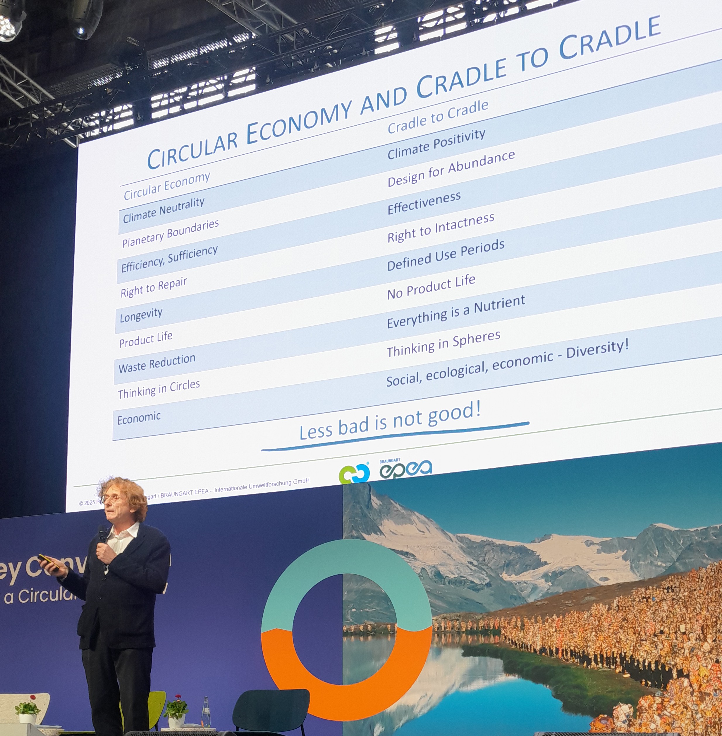 Ein Kreis bleibe immer noch Linie. Nötig sei räumliches Denken war Prof. Dr. Michael Braungarts Impuls auf der Hauptbühne der Convention.
